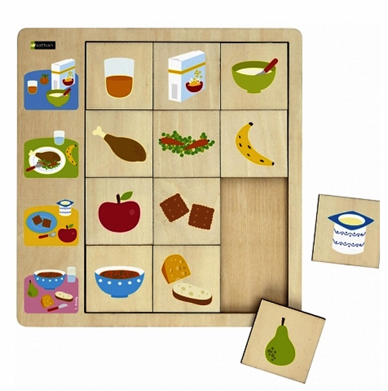 Observeer, kijk en vergelijk en leg de 3 puzzelstukjes met etenswaren achter de bijbehorende afbeelding van de blauwe, groene, gele of roze placemat. 21 x 22 cm.