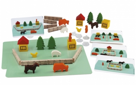 Deze set introduceert onder andere begrippen als nabijheid, symetrie en grenzen enz.. Inhoud: 2 spelborden, 18 voorbeeldkaarten, 28 gekleurde houten vormen zoals huisjes, bomen, mensen, dieren, schuttingen, 6 kunststofhouders. Beknopte handleiding bijgesloten.