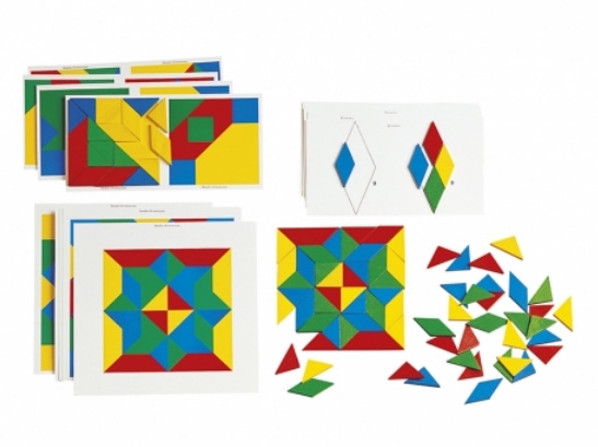 Met deze mozaïken kunnen complexe figuren worden gereconstrueerd naar voorbeeld of naar eigen fantasie. Voorbeeldkaarten 23 x 13 cm, 23 x 23 cm en 26 x 12,5 cm en 96 vormen in 4 verschillende kleuren.