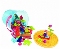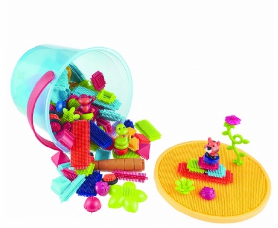 Vrolijk gekleurde bouwsticks, wielen, poppetjes, driehoeken, rechthoeken, rondjes en pyrramides, die op eenvoudige in elkaar te drukken zijn, verpakt in kunststof emmer.