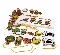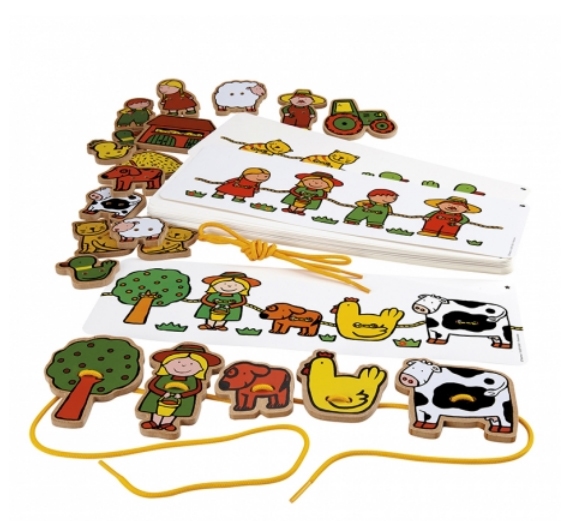 Een kleine boerderij afgebeeld op houten figuurtjes. Door de draden door de 2 gaatjes in de houten vorm te rijgen, kan er een reeks worden gevormd. Aan de hand van de voorbeeldplaten kunnen verschillende figuurtjes op volgorde worden gelegd en aan elkaar worden geregen. Zonder voorbeeldplaat wordt de motoriek nog intensiever getraind. Inhoud doos: 60 houten stukjes met 20 verschillende afbeeldingen aan beide zijden bedrukt. 24 voorbeeld/werkkaarten, 4 rijgkoorden en een beknopte handleiding.