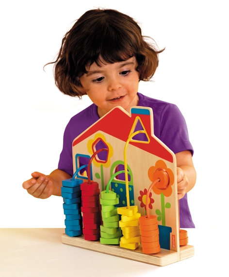Laat de vormen door de deuren en de ramen glijden. De kleur van de vormen komt overeen met de kleuren van de openingen in het huisje. Stimuleert de fijne motoriek en ontwikkelt schrijfbewegingen, bevordert de hand/oog coördinatie en heeft inzicht in het verplaatsen van de ene naar de andere kant. Afmeting: 29 x 29 cm.