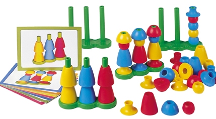 Over de basis, bestaande uit 3 pinnen, kunnen 4 verschillende vormen in 3 verschillende kleuren geschoven worden. De simpele rustige vorm van het materiaal voelt zeer prettig aan. Een spel waarbij de fantasie volop aan bod komt, wordt met 20 voorbeeldplaten oplopend in moeilijkheid geleverd. Inhoud: 4 basisvormen, 48 gekleurde vormen en 20 voorbeeldplaten.