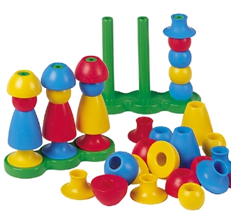 Over de basis, bestaande uit 3 pinnen, kunnen 4 verschillende vormen in 3 verschillende kleuren geschoven worden. De simpele rustige vorm van het materiaal voelt zeer prettig aan. Een sorteerspel waarbij de fantasie volop aan bod komt. Inhoud: 2 basisvormen, 24 gekleurde vormen.