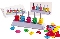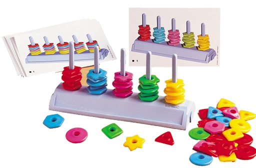 Kunststof sorteerstandaard met 5 pennen waarop 5 verschillende vormen in 5 kleuren moeten worden gesorteerd. Inhoud: 4 plastic sorteer-standaards met 5 pennen, 100 vormen in 5 kleuren en vormen en 36 voorbeeldkaarten.