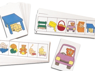 Met het gebruik van voorbeeldplaten kunnen de afzonder-lijke plaatjes op de platen worden gelegd. Door vragen te stellen kunnen zinnen worden geformuleerd en wordt er geoefend met voorzetsels en bijvoeglijke naamwoorden. 36 speelkaartjes, 18 voorbeeldplaten en een handleiding.