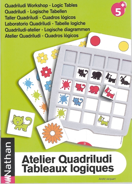 Met Quadriludi Logische Diagrammen wordt kennis gemaakt met het principe van de diagrammen met vormen en ruimtelijke verbanden. Inhoud 6 diagramroosters, 36 modelkaarten verdeeld over 6 reeksen. 3 reeksen met als thema vormen (roze, blauwe, oranje), 3 reeksen met als thema ruimtelijke verbanden (groene, rode en gele). 206 kaartjes van stevig karton, waarvan 96 om de vormen uit te werken, 96 om de ruimtelijke verbanden uit te werken, 14 extra kaartjes om zelf logische diagrammen samen te stellen
