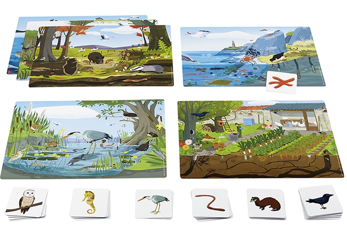 Taalspel Natuur, een natuurspel om de wereld en de biodiversiteit van 6 verschillende natuurlijke omgevingen te ontdekken, waaronder: de moestuin, het platteland, een vijver, de kust en de zeebodem. Inhoud: 6 geïllustreerde afbeeldingen en 48 geïllustreerde kaarten met handleiding.
