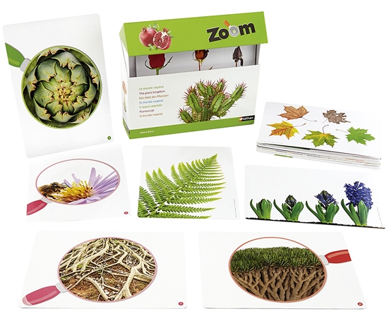 De set Zoom in op Plantenrijk bestaat uit 5 series van 8 grootformaat, dubbelzijdige afbeeldingen. Op de voorkant: een detail met een vergrootglas om nieuwsgierigheid op te wekken, vragen te stellen, de planten herkennen en benoemen. De kenmerken van het plantenleven en de cyclus van de seizoenen leren kennen. Op de achterkant: identificatie van de afgebeelde plant. Elke serie komt overeen met een thema van het plantenleven: 1. het omhulsel van de plant; 2. de cyclus van de seizoenen; 3. wortelen en bewegen; 4. Groei en voortplanting; 5. Voeding en gezondheid. De verscheidenheid en de kwaliteit van de afbeeldingen wekken spontaan de aandacht en de belangstelling van het onderwerp op.