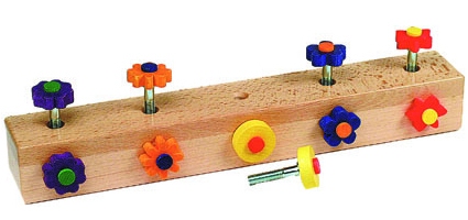 Eenvoudig sorteerspel. De grote bloemknoppen zijn makkelijk te hanteren en geschikt om er schroefbewegingen mee te oefenen. Afmeting van het beukenhouten blok: 44 x 6,5 x 6 cm.
