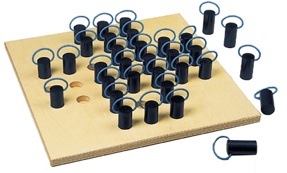 Deze variant biedt verscheidene oefenmogelijkheden zoals: het strekken van de vingers, buigen van de vingers, pincettanggreep met behulp van een wasknijper. Speelbord 48 x 48 cm, 33 beugels van flexibel kunststof en 3 wasknijpers in verschillende afmetingen.