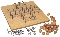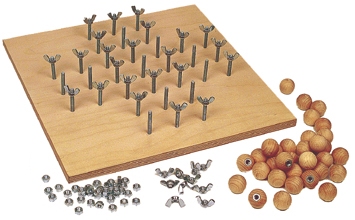 Dit is niet alleen een strategiespel. Het doel van het 'spel'is om de op het bord geschroefde moeren door tactisch overspringen te verwijderen. Dit 'spel' past in een training van de fijne motoriek. Het opzetten van de moeren vergt namelijk maat-en precisiewerk. Op hetzelfde bord kunnen met 3 verschillende soorten moeren meerdere varianten worden 'gespeeld'. Speelbord: 36 x 36 cm, assortiment vleugelmoeren, zeshoekige moeren en een assortiment houten schroefkogels.