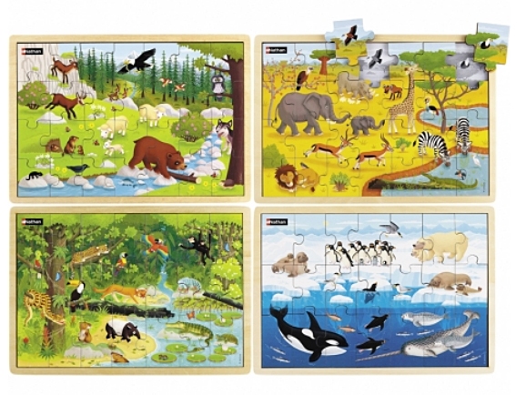 Set van 4 puzzels 30x21 cm, 21 en 28 stukjes met dieren van de wereld in de woestijn, poolgebied, bergen of in het Amazonegebied.